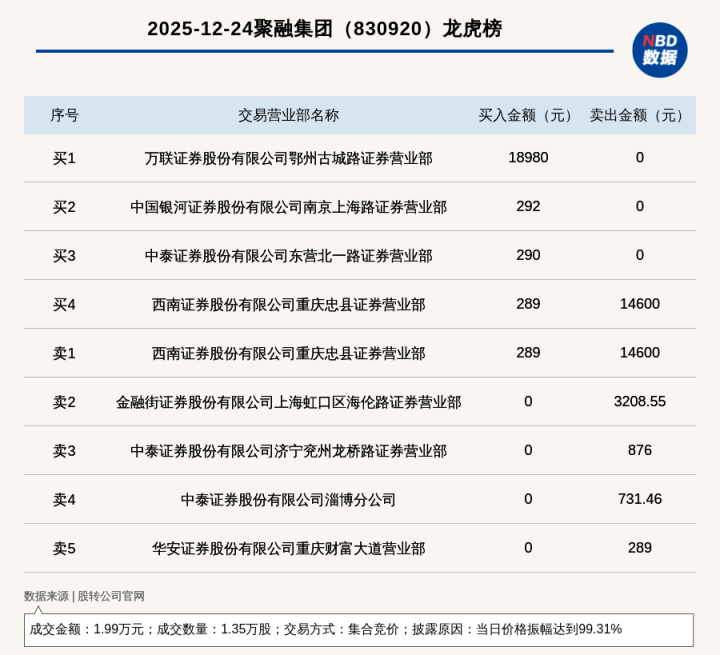 每经讯,2025年12月24日,新三板创新层公司聚融集团(830920,收盘价:1.46元)登上龙虎榜,交易方式是集合竞价股票融资系统排行,披露原因是当日价格振幅达到99.31%,成交数量1.35万股,成交金额1.99万元。买一席位为万联证券股份有限公司鄂州古城路证券营业部,买入1.9万元;卖一席位为西南证券股份有限公司重庆忠县证券营业部,卖出1.46万元。